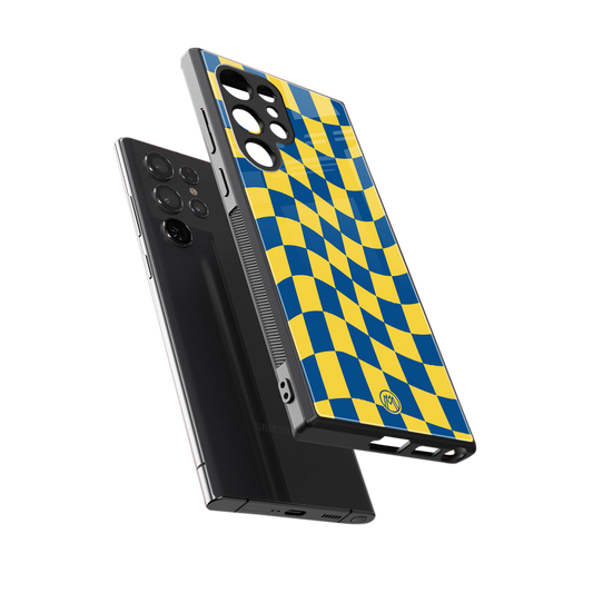 Yellow Blue Trippy Check Pattern Phone Case for Samsung Galaxy S23 Ultra | Glass Case